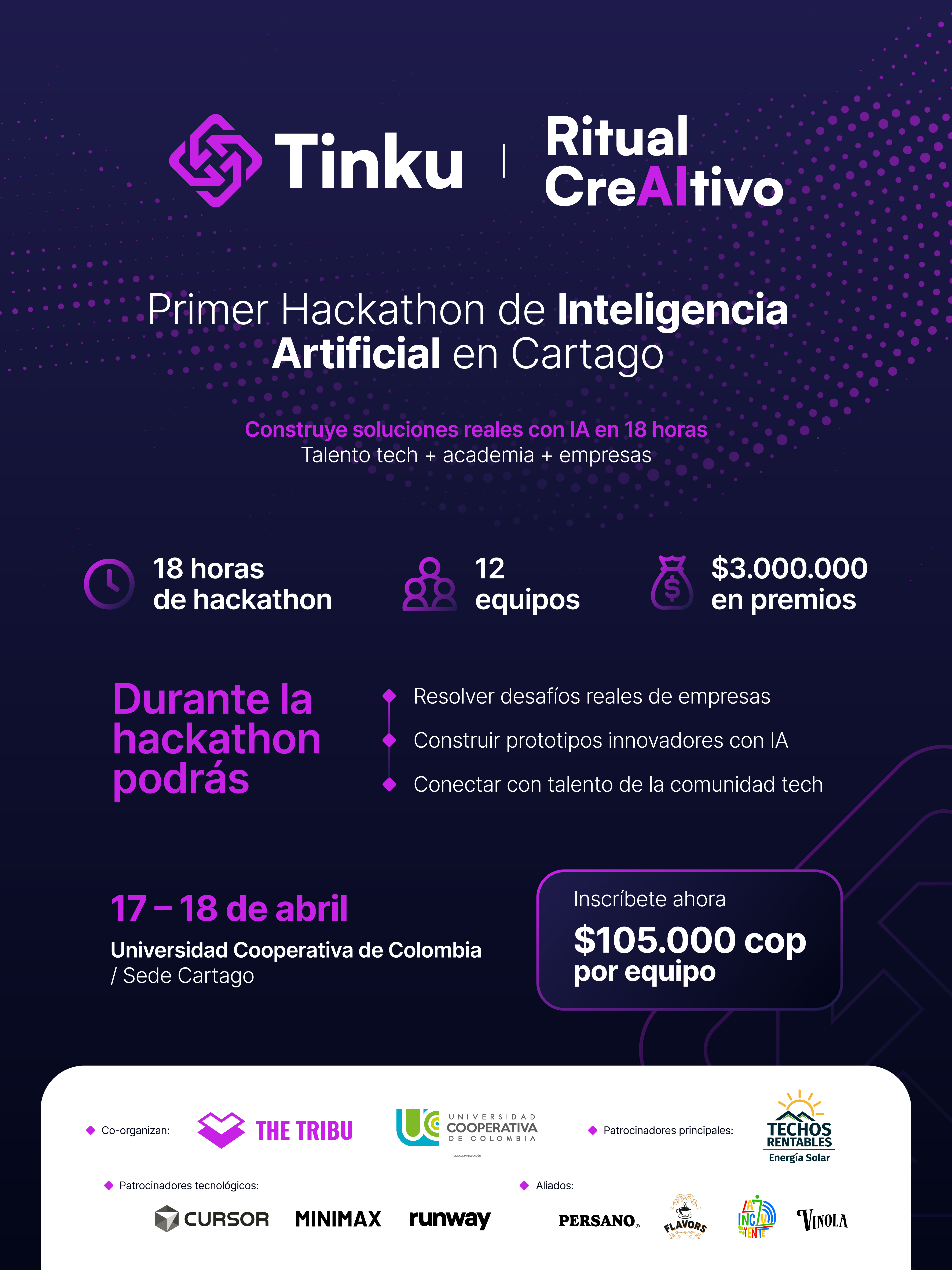 Por eso, desde The Tribu, quisimos crear un espacio para encontrarnos, construir juntos y demostrar lo que es posible cuando el talento local, las empresas y la academia se conectan. Así nació TINKU – Ritual CreAItivo, la primera hackathon de inteligencia artificial en Cartago, que estamos organizando junto con la Universidad Cooperativa de Colombia.