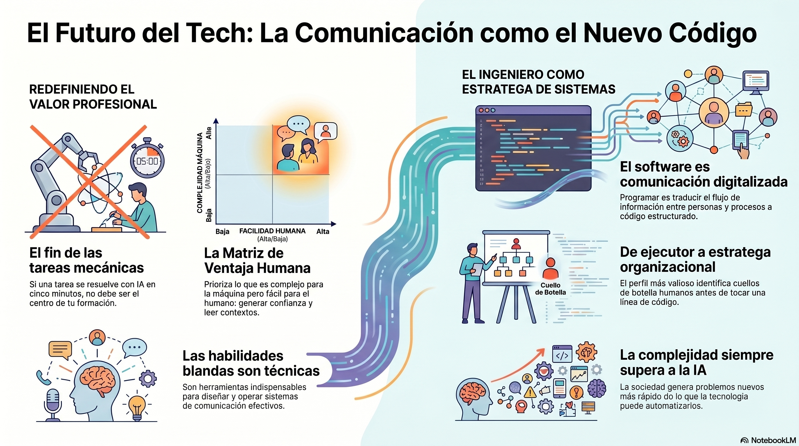 Entonces el ingeniero que entiende cómo se comunica una organización no es solo un ejecutor técnico. Es el que puede decirle a la dirección: “acá hay un cuello de botella humano”, “este equipo no está recibiendo información a tiempo”, “este proceso está mal diseñado desde antes de tocar una línea de código”.